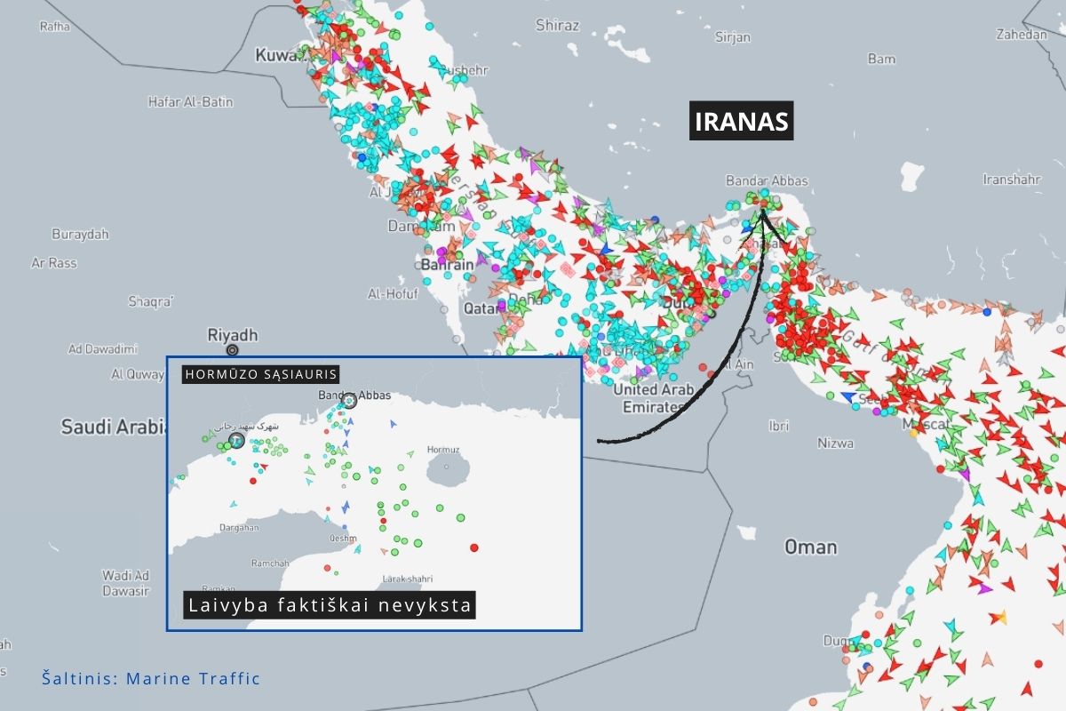 Kaip sekmadienio pavakare rodė pasaulinės laivybos stebėjimo platforma „Marine Traffic“, Hormūzo sąsiaurio prieigose absoliuti dauguma laivų tiesiog stovėjo vietoje. Irano institucijų sprendimų dėl sąsiaurio uždarymo nėra, tačiau daugelis laivybos kompanijų sustabdė operacijas dėl saugumo. "Marine Traffic" duomenys rodo laivų kaupimąsi ir sustojimus, bet tai reiškia ne tiek oficialų draudimą, kiek praktinį vengimą plaukti rizikingoje zonoje.